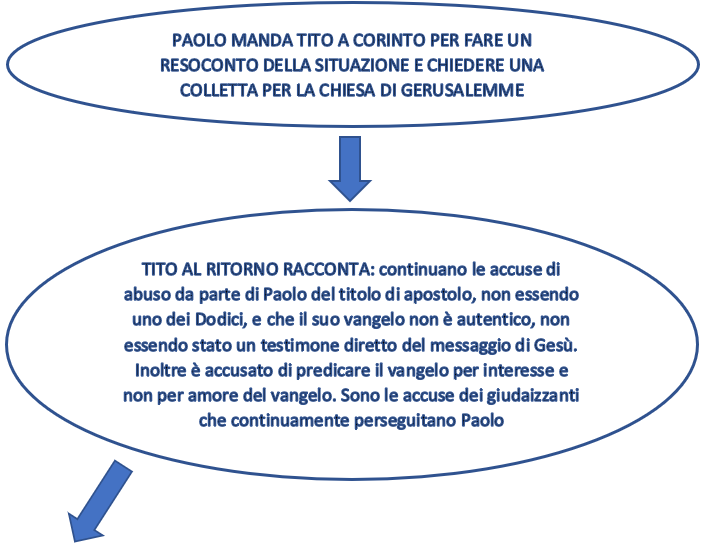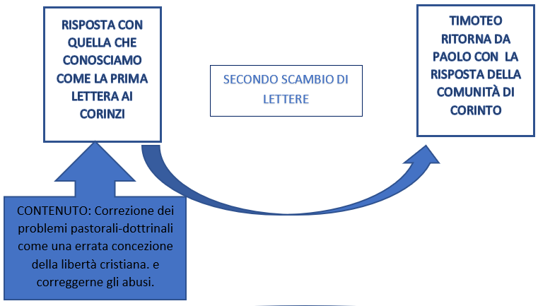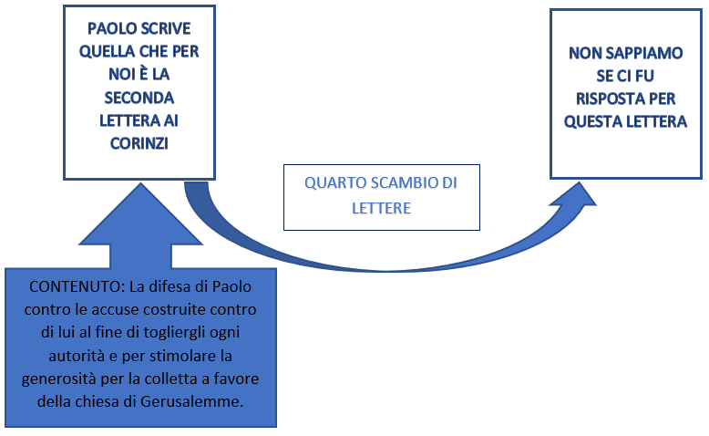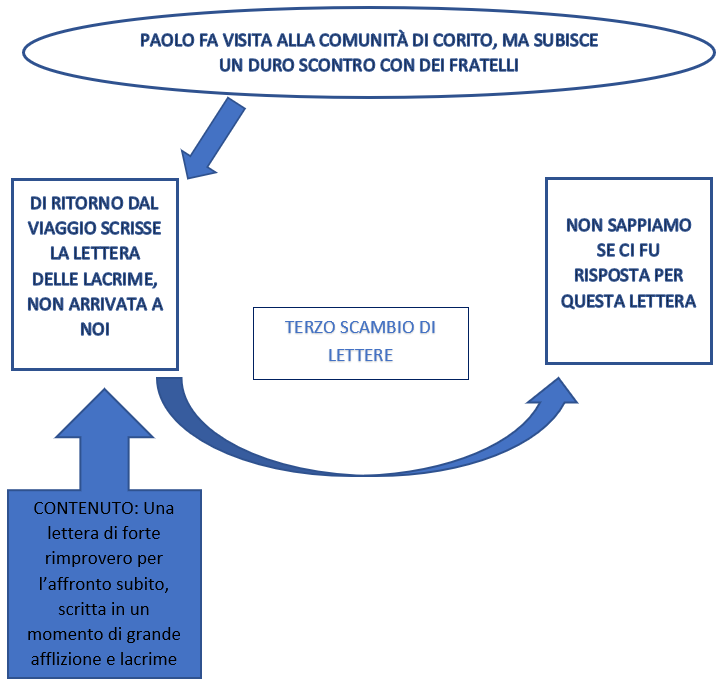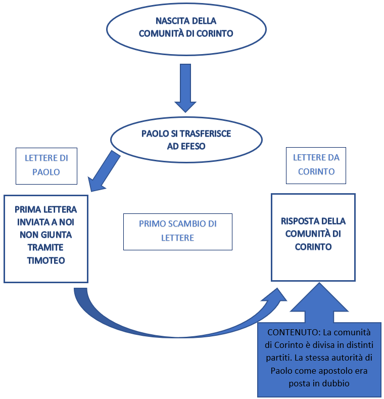 Quelle che noi conosciamo come la prima e la seconda lettera ai Corinzi non sono in realtà le uniche lettere, sappiamo attraverso gli scritti di Paolo e dagli atti che ci sono in realtà altre due lettere che sono andate perse, vediamo quindi la successione degli eventi in maniera schematizzata per comprendere meglio la successione degli eventi e collocare meglio le lettere che abbiamo nel giusto contesto.